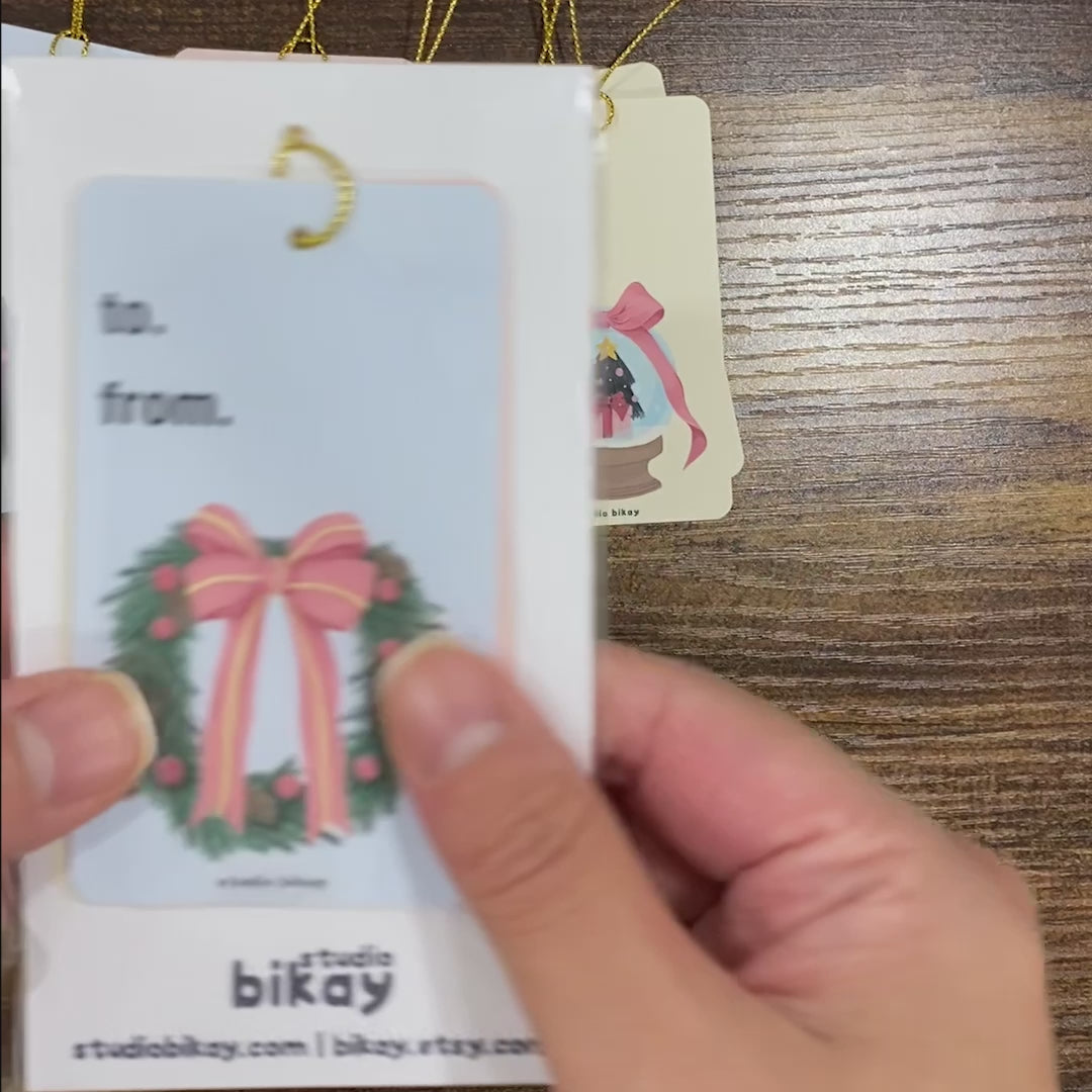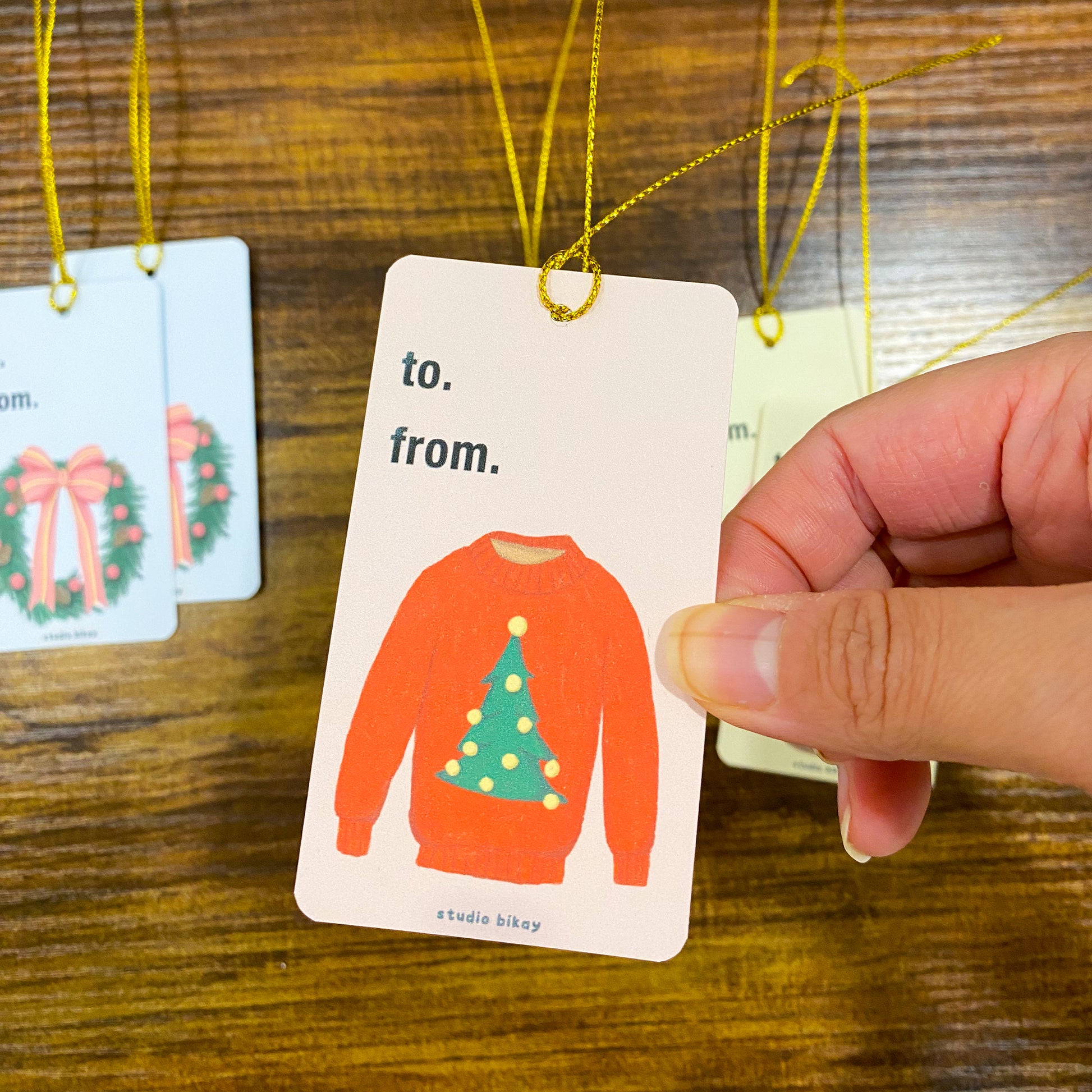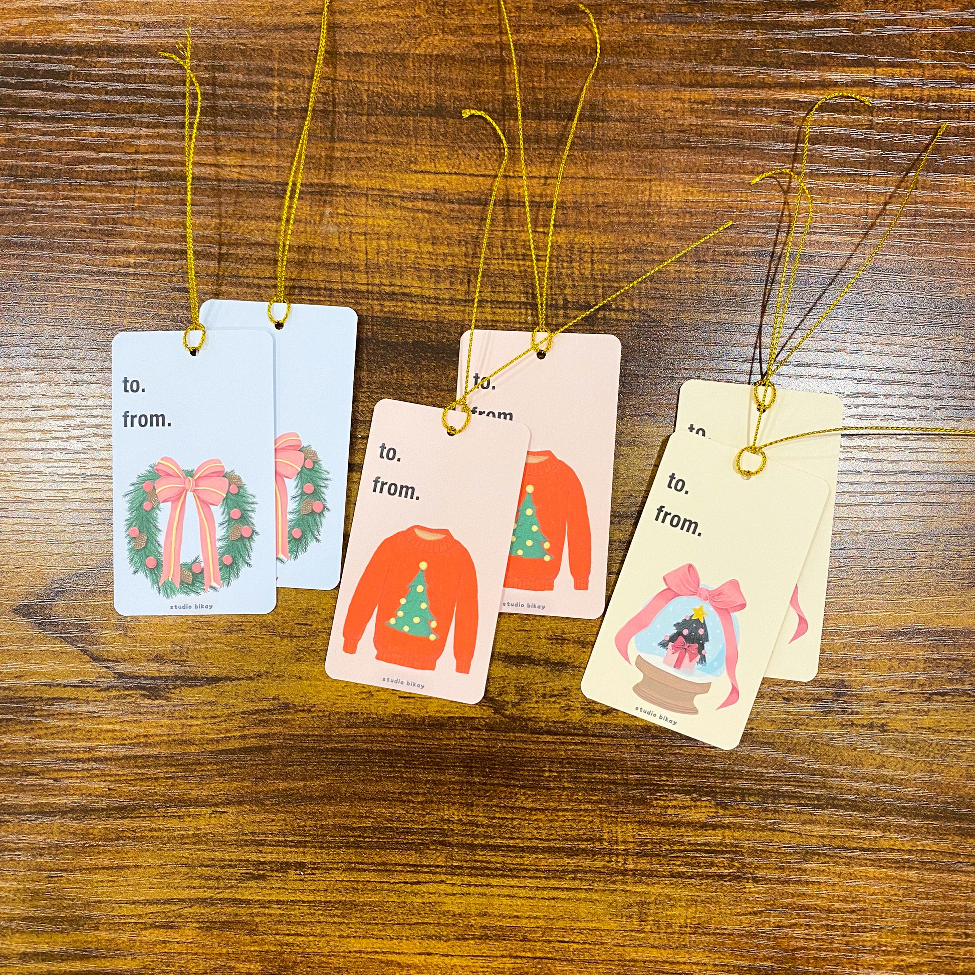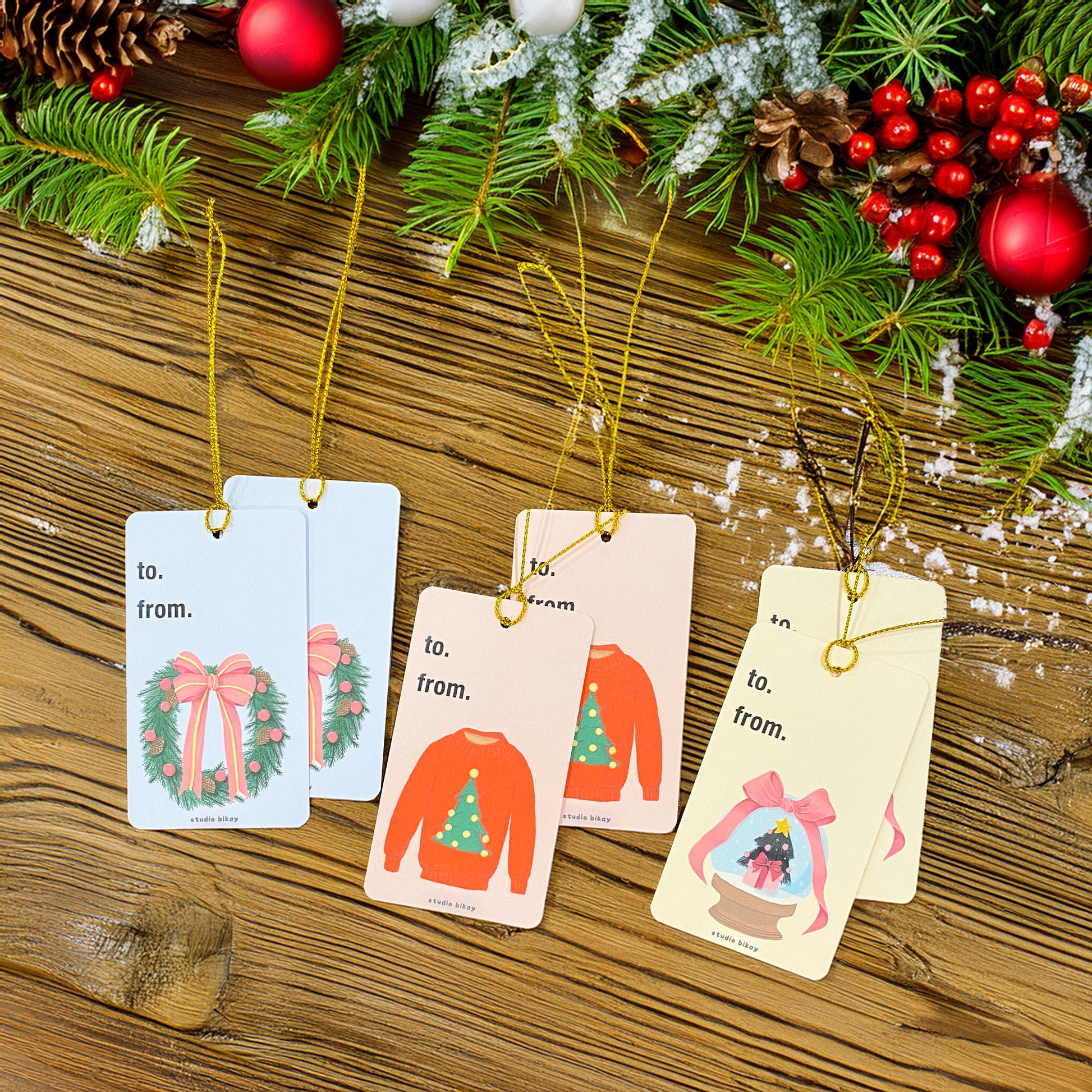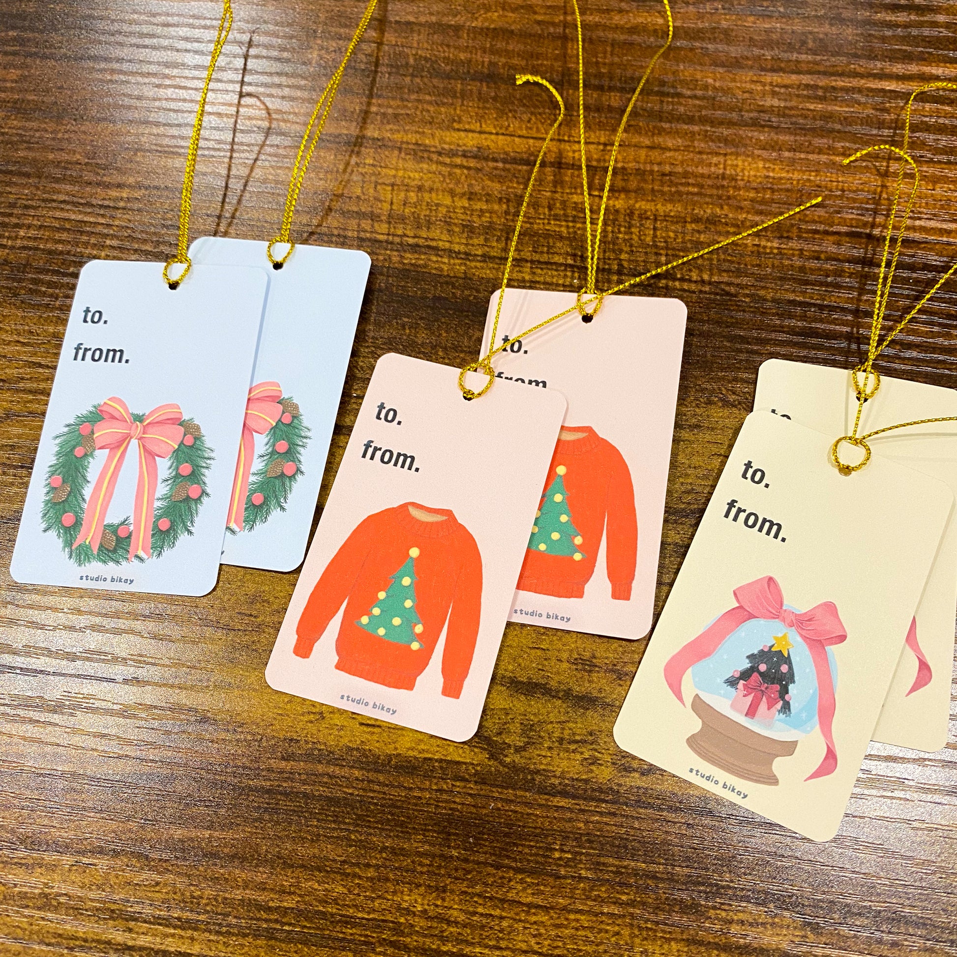 6 Tags with 6 gold strings in total, 2 of each designs ( Christmas Wreath, Christmas sweater, Christmas snow globe)